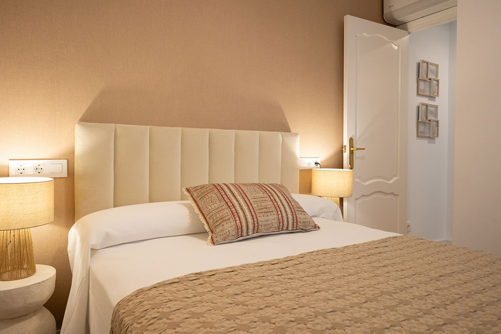 La vivienda ofrece capacidad para hasta cuatro personas y se distribuye en un dormitorio principal con cama de matrimonio y armario empotrado, así como un segundo dormitorio con dos camas individuales. La cocina está equipada con todo el menaje y utensilios necesarios.