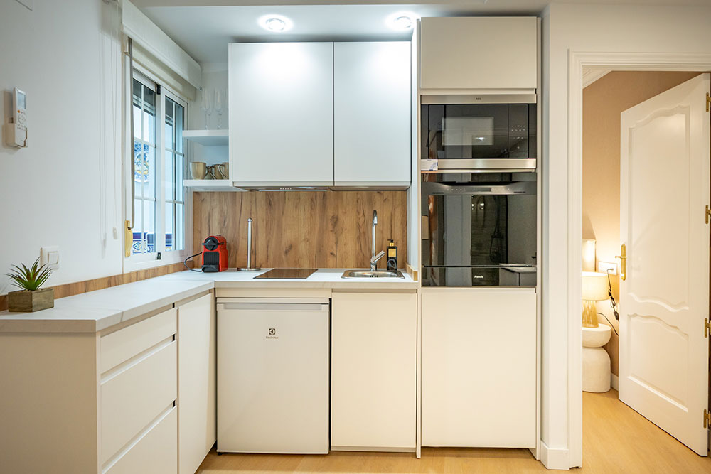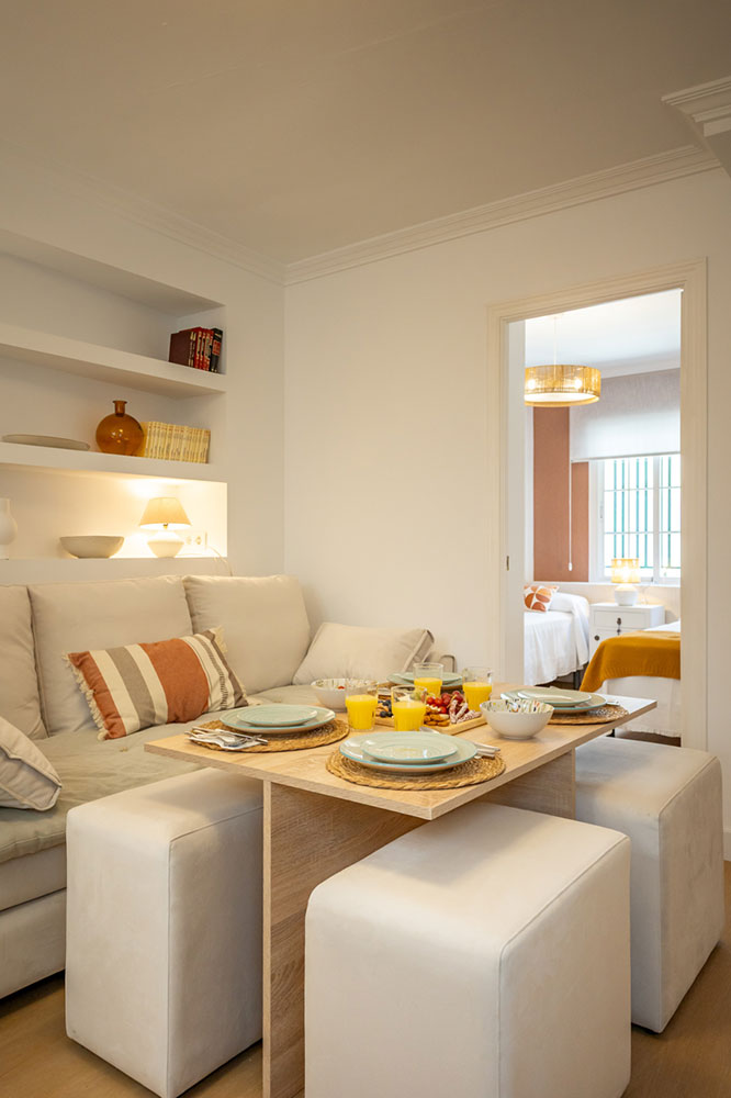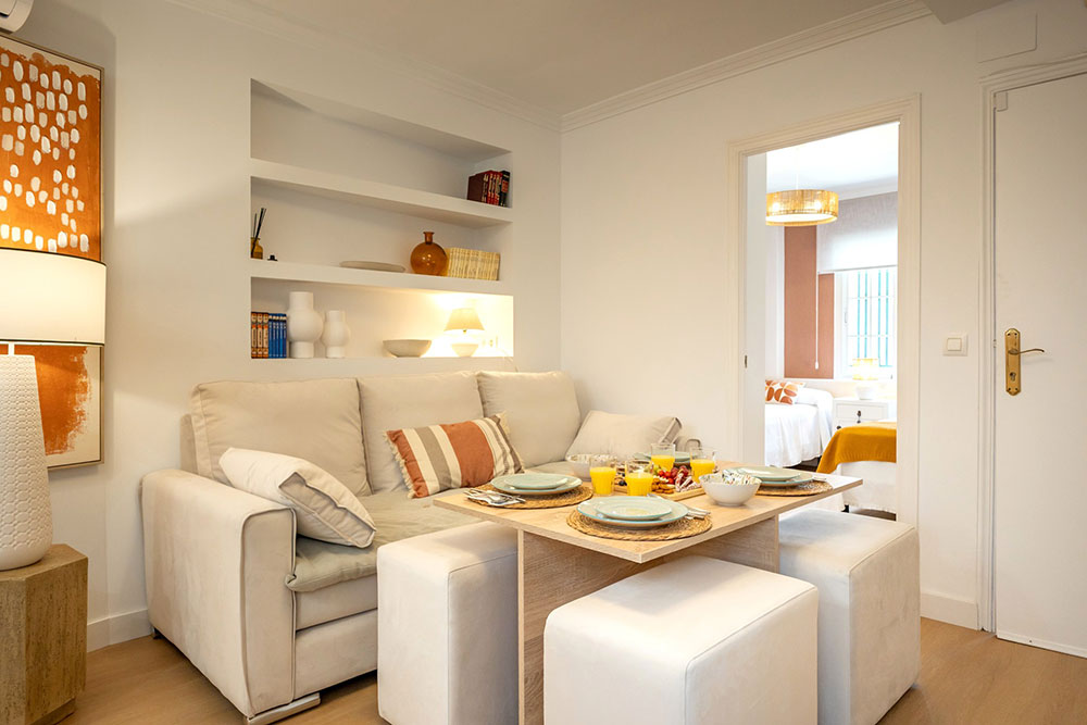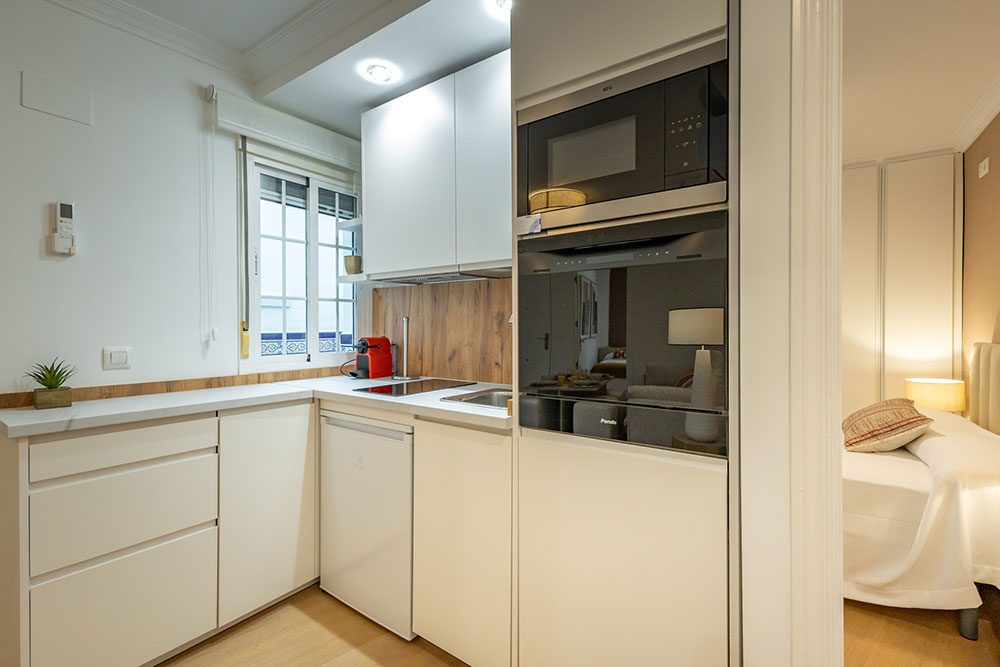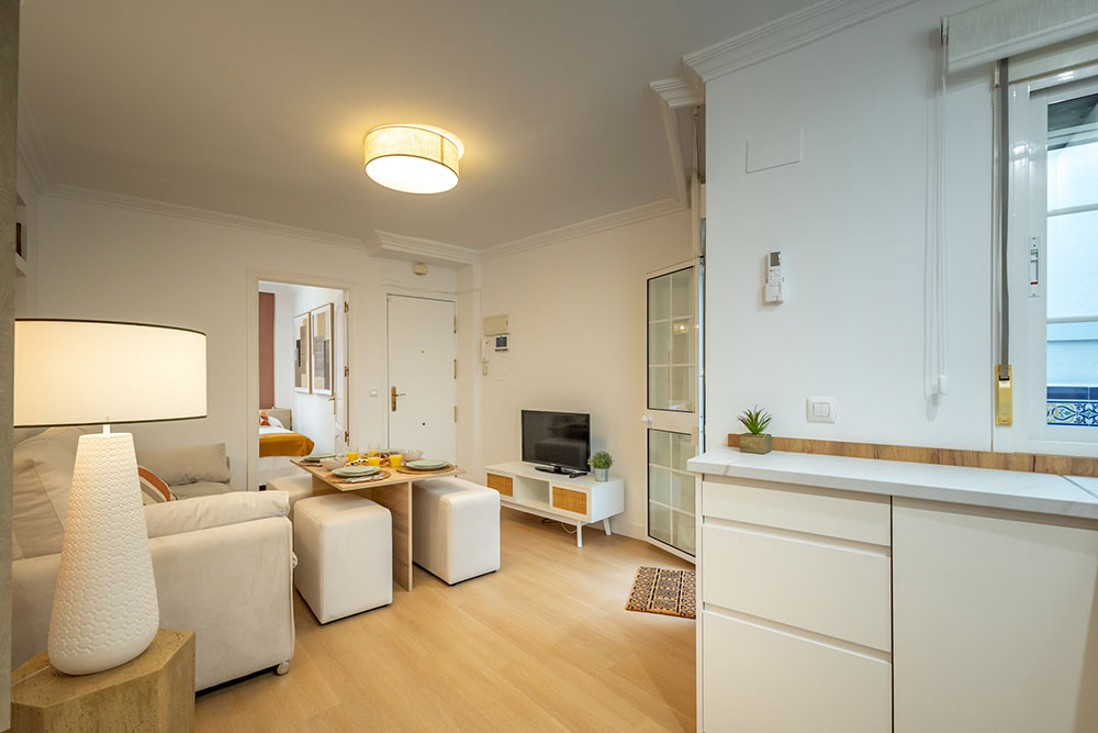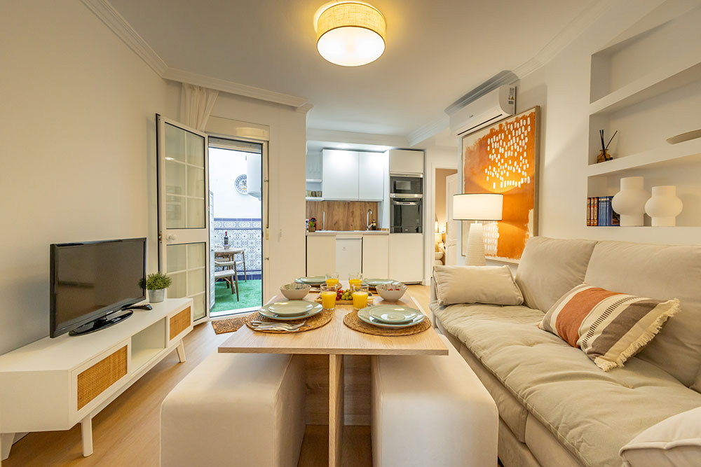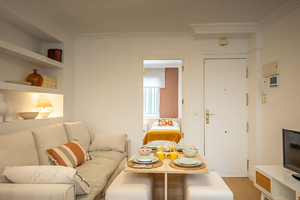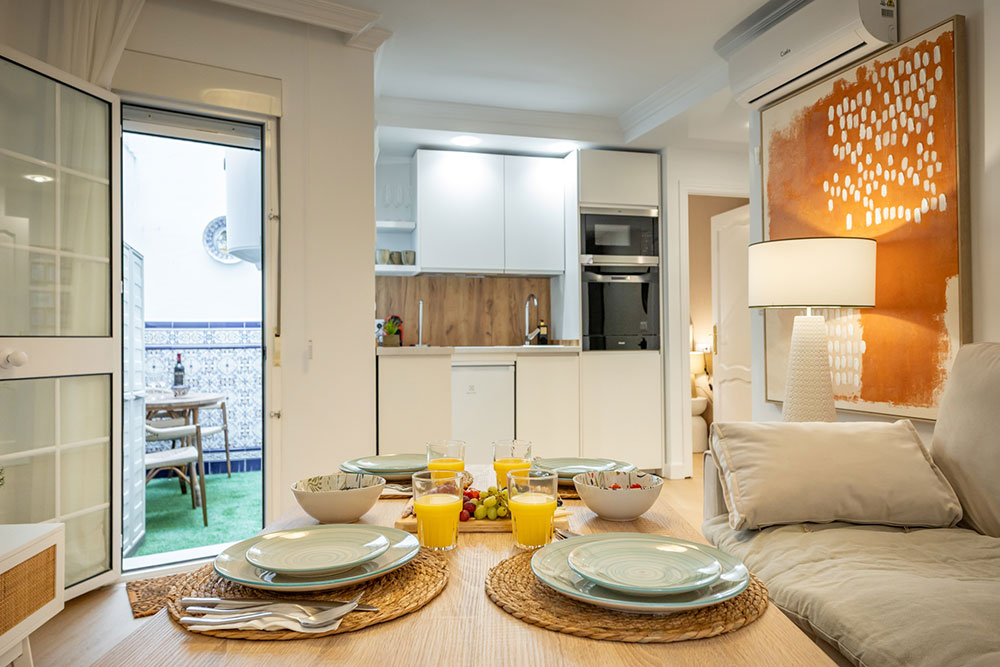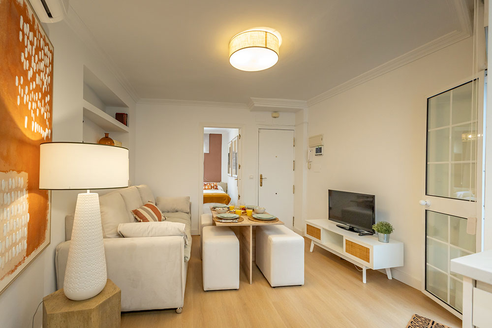 Nuestro elegante y confortable apartamento Molino se encuentra situado en una tranquila calle, a escasos metros de la vibrante Alameda de Hércules. Su ubicación privilegiada permite llegar caminando en aproximadamente 20 minutos a la Catedral y al Real Alcázar, además de estar rodeado de una amplia oferta de tiendas, bares y restaurantes.