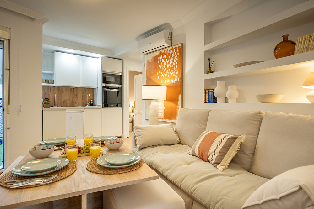 El salón dispone de un cómodo sofá, televisión y una mesa de comedor ideal para disfrutar de agradables momentos. Asimismo, el apartamento cuenta con aire acondicionado, calefacción y conexión WiFi, garantizando una estancia confortable en cualquier época del año.