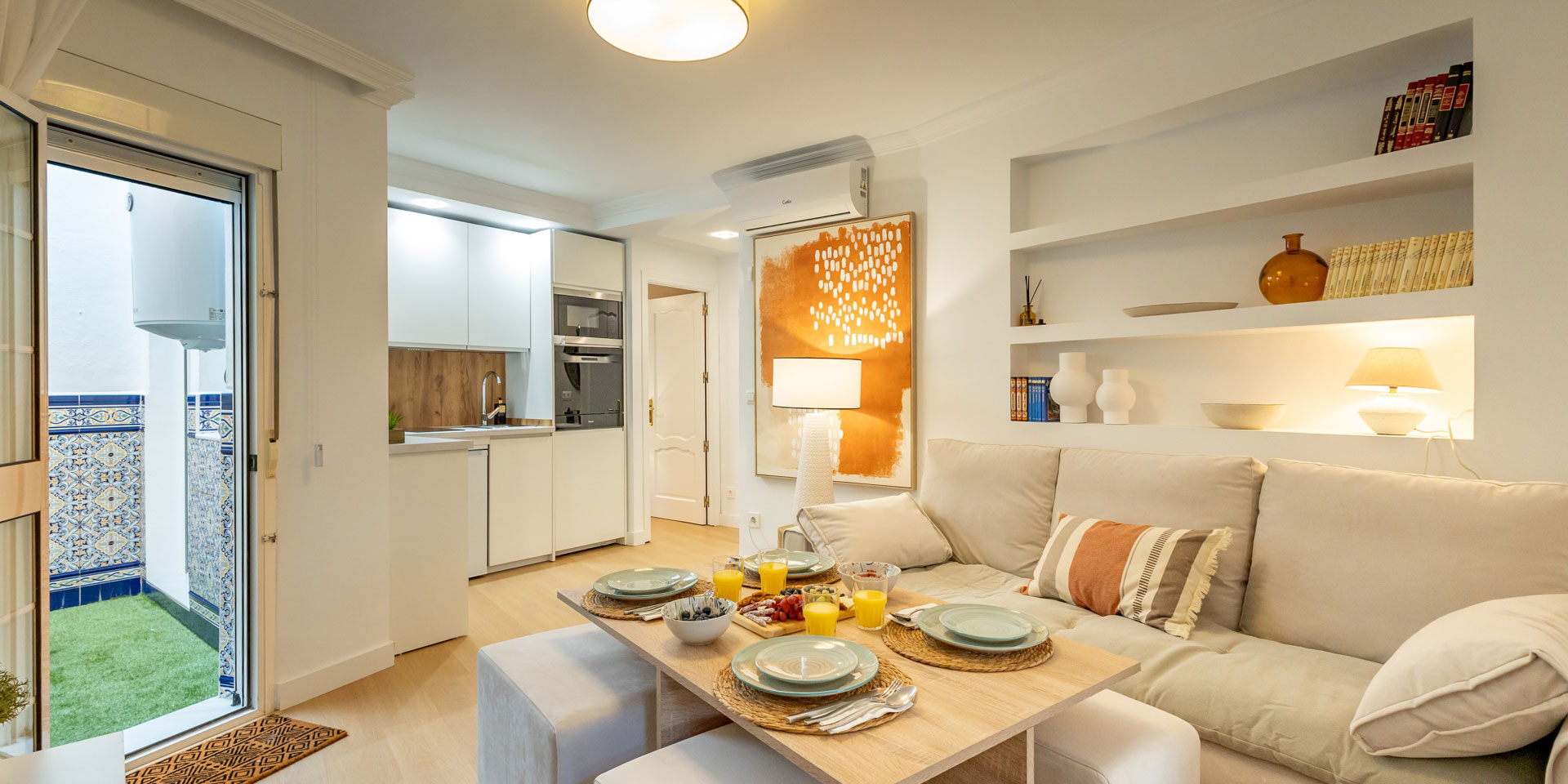 El apartamento se encuentra en planta baja, aunque para acceder es necesario subir algunos escalones. Dispone además de un luminoso patio interior que brinda tranquilidad y privacidad. Cuenta con una cocina completamente equipada, integrada al salón-comedor, y un baño completo.